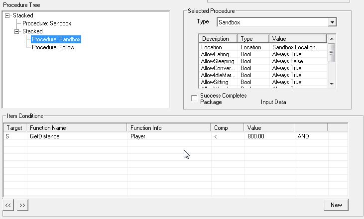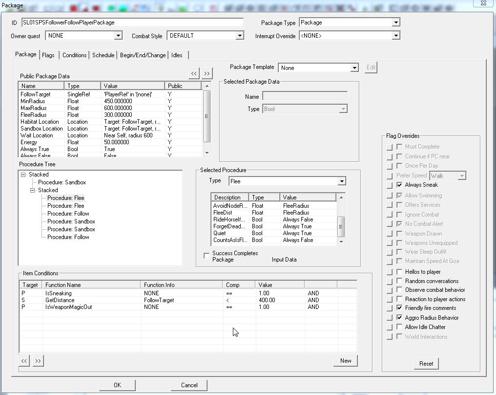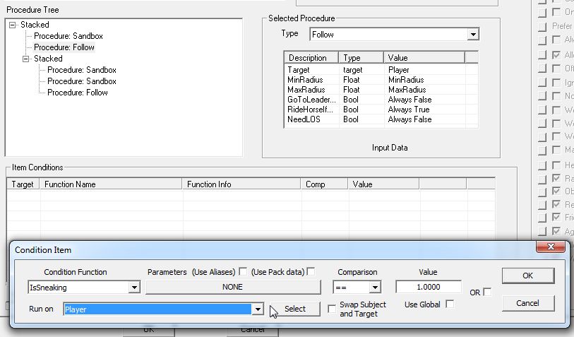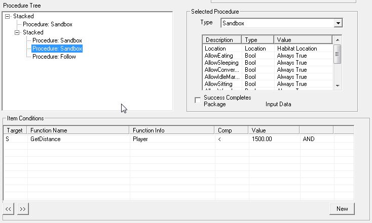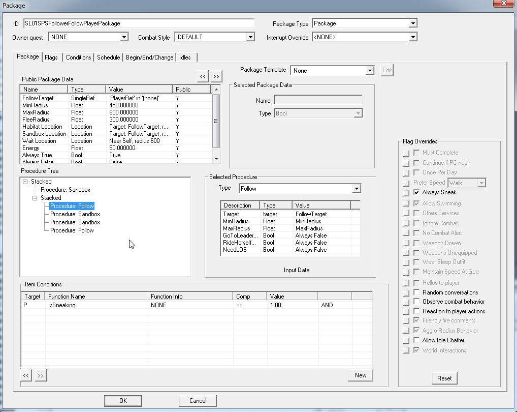 今回はプレイヤーが隠密しているか否かでAI Packageを分けるという手もあるのですが、ちょっと複雑なProcedure Treeを作ってみたいという欲求もあるので、欲望に素直に従うことにしました。