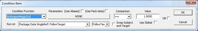 Conditionsでは「IsWeaponMagicOut」というのを"FollowTarget"に対して使っています。武器であれ魔法であれ素手であれ、構えた状態だと1になるらしい。