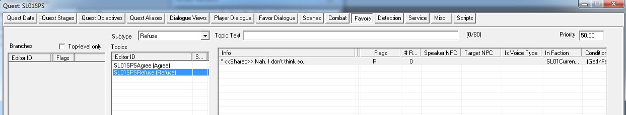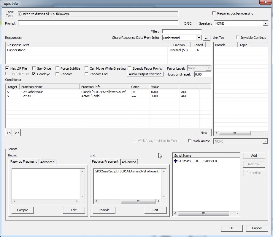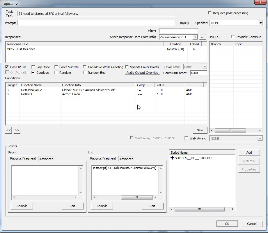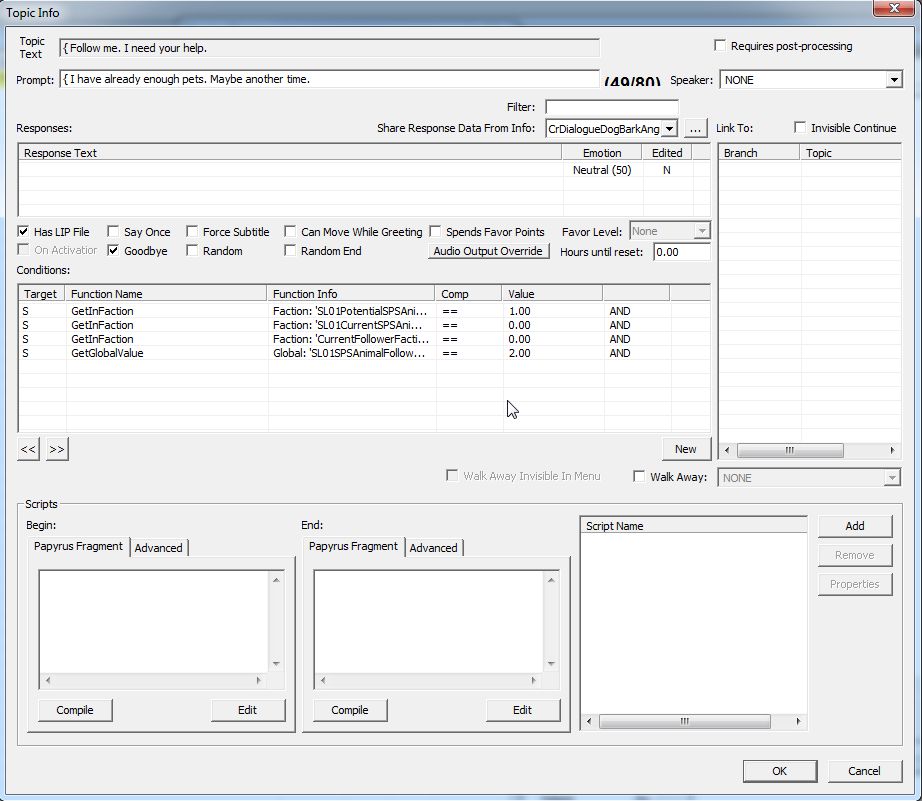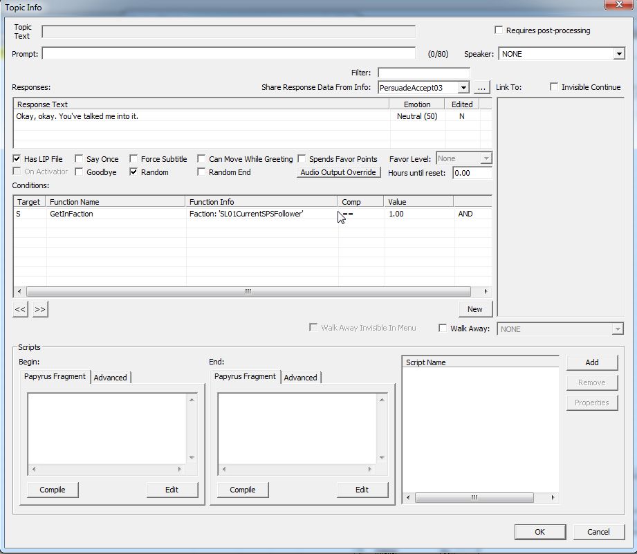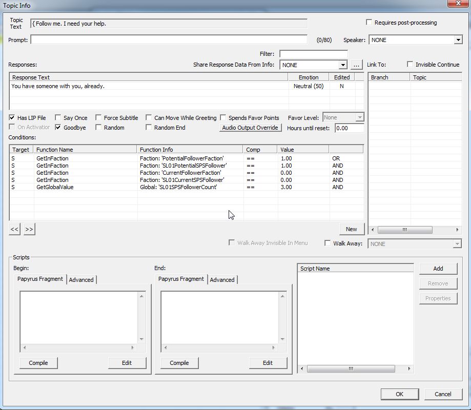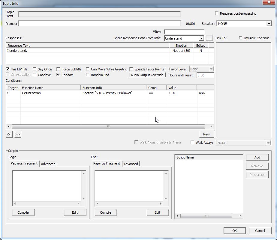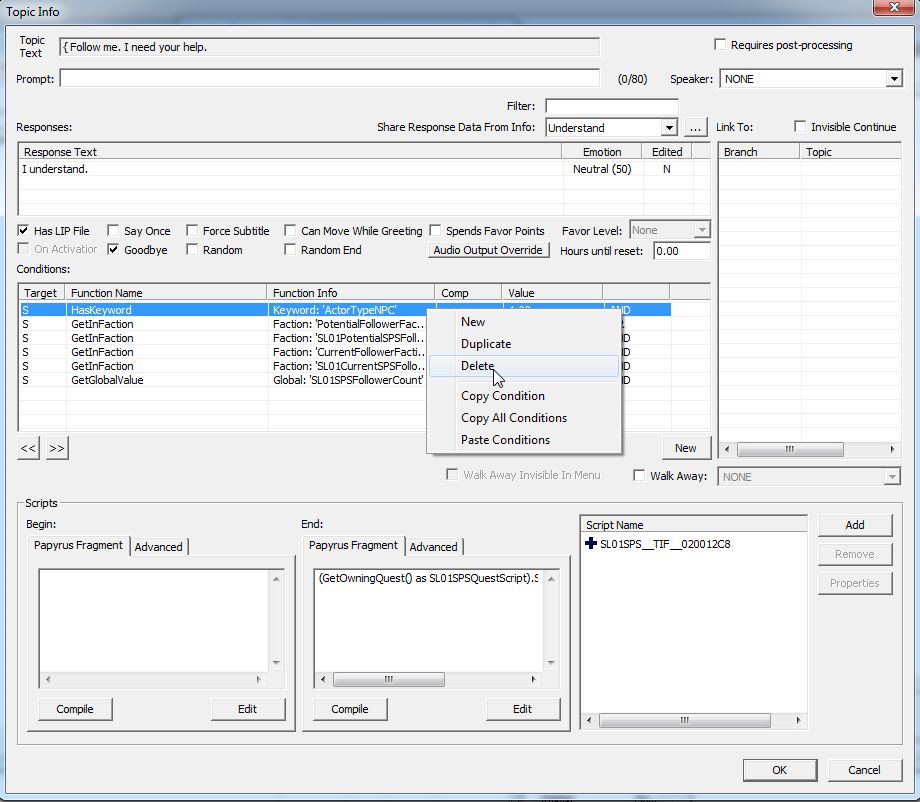 Conditionsは、「自作の人間フォロワー用Currentファクションに入っている」だけを設定しておきます。これでこの自作クエストのFavorモードセリフが、他のフォロワーModに影響を与えることはないでしょう。