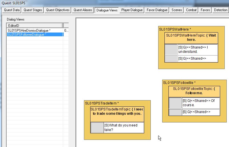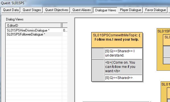 そしてこのダイアログを出すのは、とりあえずですがドラゴンブリッジの宿の女主人ファイダさんにしました。宿の主人をフォロワーとして連れ出すことはまずないと思うので、メンテナンスの役割をお願いするのに最適です。Conditionsを加えて、雇用中のフォロワーに話しかけても同じダイアログが出るようにしてもいいかもしれません。