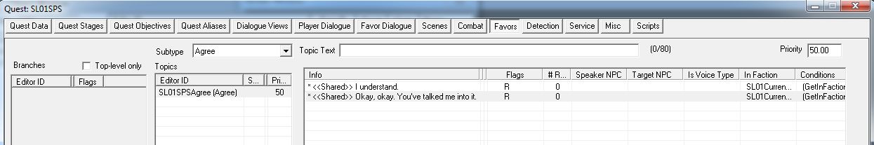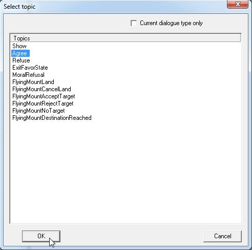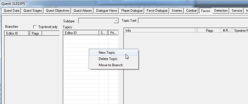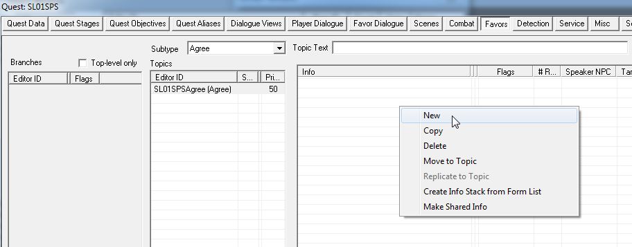 Topicのところに(Agree)と付いたEditorIDが加わります。改めてこれを選択し、右側のInfo欄で右クリックしてNew。
