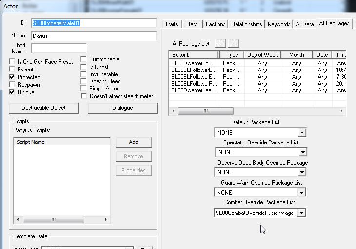ActorデータのAI Packagesタブにて設定できる場所があります。しかしActorデータに登録されている情報は、クエストの「エイリアス」というものによって実行されなくなることが多々あります。なので今回の場合、実はActorデータに登録するのは全く意味がありません。