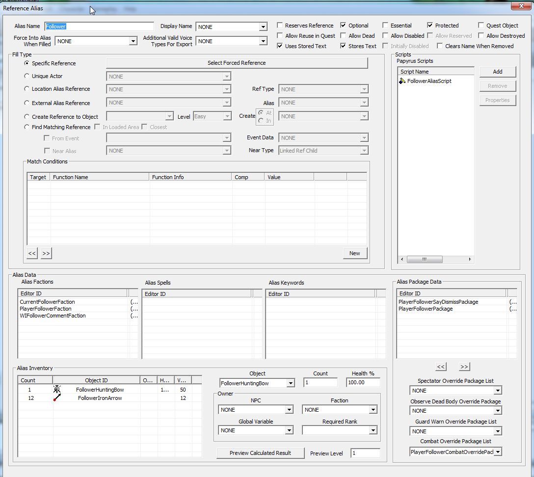 エイリアスは適用されている間だけ、そのNPCに追加設定を与えます。ざっと見るとプレイヤーに追従するAIや、フォロワー専用ファクションなどの設定が登録されているのが分かります。エイリアスのAI Package Listに登録されているPackageは、ActorデータのAI Package Listに上乗せされる形になります。