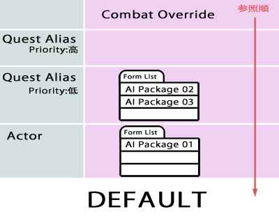 これもやっぱり通常のAI Package Listと同じなのですが、特定のNPCに適用されているエイリアスを含めて全体を見ると、上図のようになります。