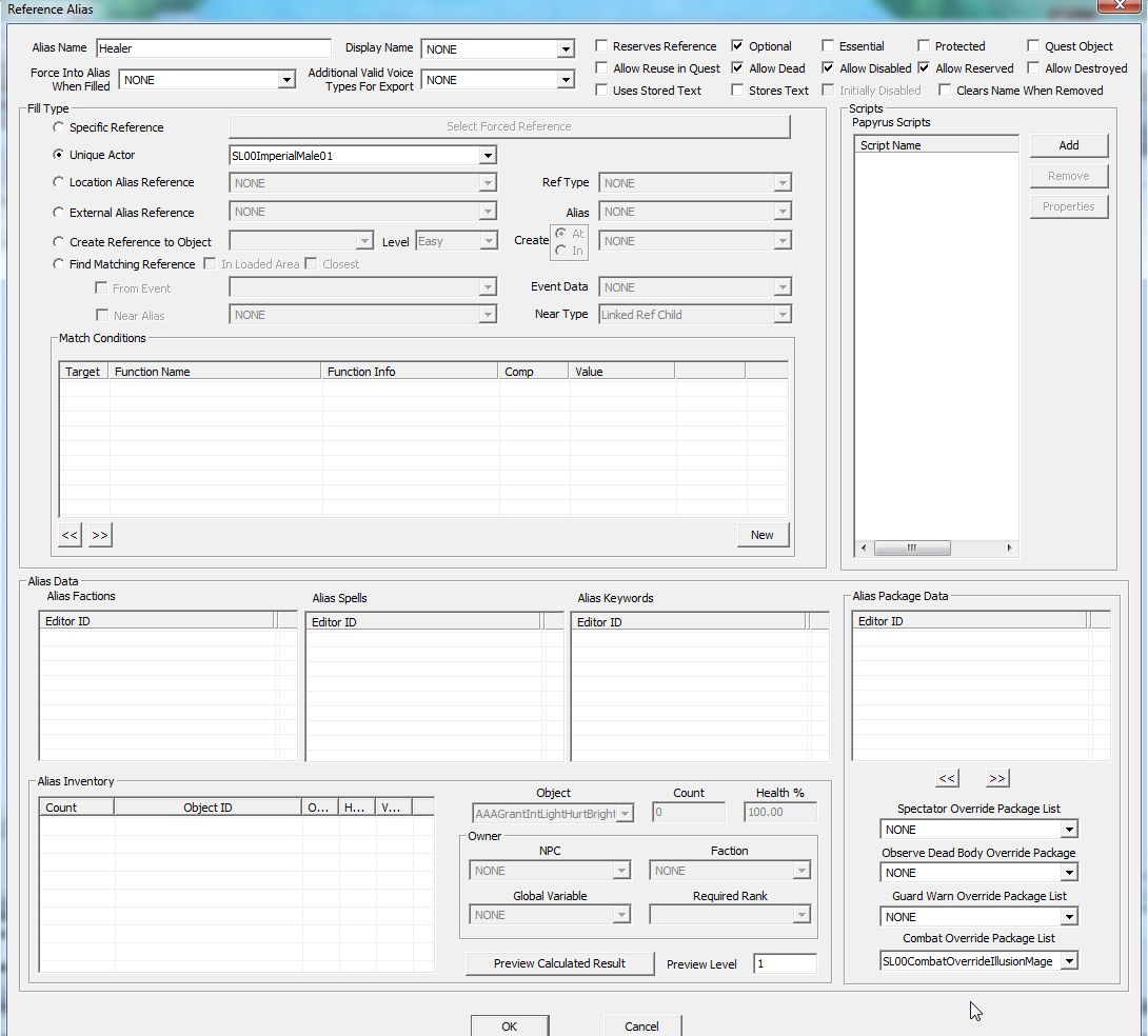 上図の「優先度:低」のクエストをフォロワー雇用クエストと見るならば、これへさらに上乗せできる「優先度:高」のクエストを作り、そこのエイリアスにPackage Listを登録。エイリアスをNPCに被せることが必要になります。