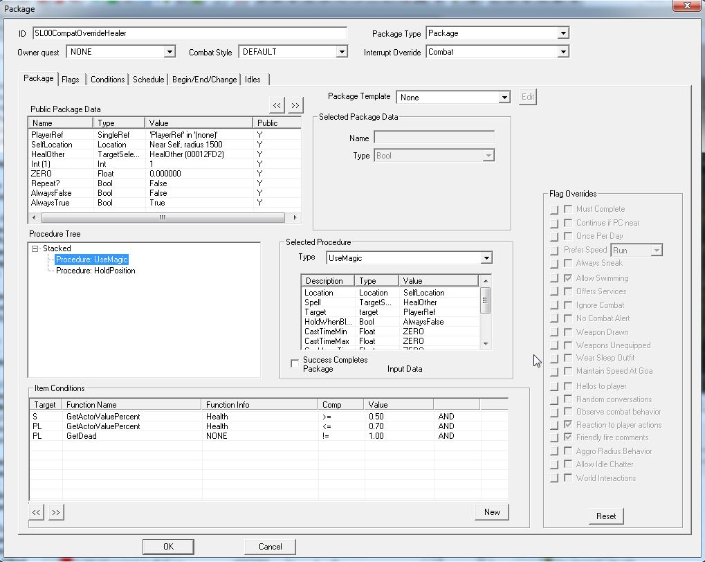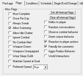 それ以外は通常のAI Packageを作るときと同じ方法でいけます。戦闘用なので、「Ignor Combat」などFlagsタブのいくつかの項目は機能しない等の違いはあります。