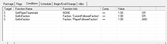 Conditionsタブにて、そのNPCがプレイヤーのフォロワーになっているときだけこのCombat Overrideが有効になるようにします。