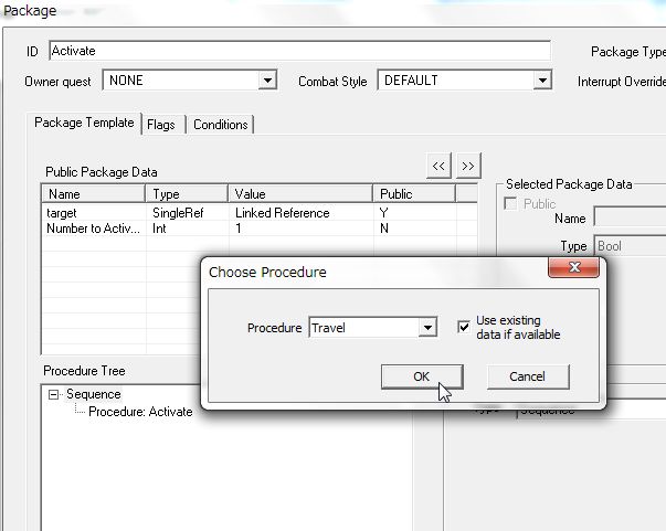 この3つの共通点は、Procedure Treeの一番上が"Procedure: Activate"になっているところです。AIがスタートすると、この"Procedure: Activate"で指定されたオブジェクトをすぐさまアクティベートしに行くようになっています。しかしこのProcedureは、本人とオブジェクトが同一セルか同じワールドにいないとなんらかの問題が生じ、AIが停止してNPCがその場で棒立ちになってしまうようです