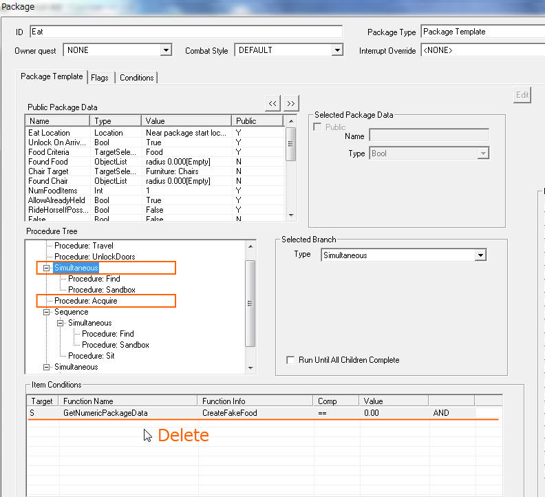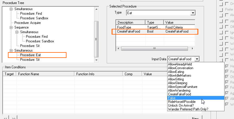 すると一番下の「Item Conditions」の所に"GetNumericPackageData CreatFakeFood == 0.00"という条件が一行だけでてきます。これを選択して「右クリック>Delete」で消します。