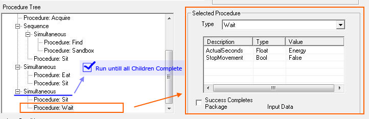 Treeの一番下に"Simultanious"ブランチを追加して、"Procedure: Sit"と"Procedure: Wait"を下位に並べています。設定は上の通り。"Procedure: Sit"はすぐ上にある"Procedure: Sit"と全く同じ設定です。