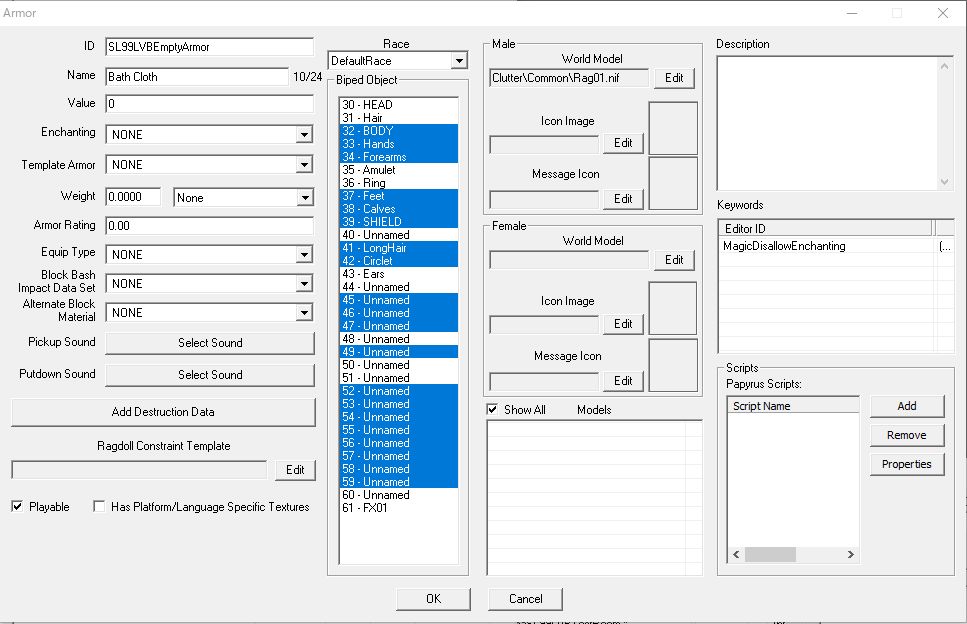 外したい装備部位のSlotを全て選択。Playableにチェックを入れ、万一の時でもプレイヤーがNPCの持ち物欄からアイテム交換で取り出せるようにします。念のためにWorldModelも設定して、間違えて持ち物欄から捨ててもまた拾えるようにしておきます。