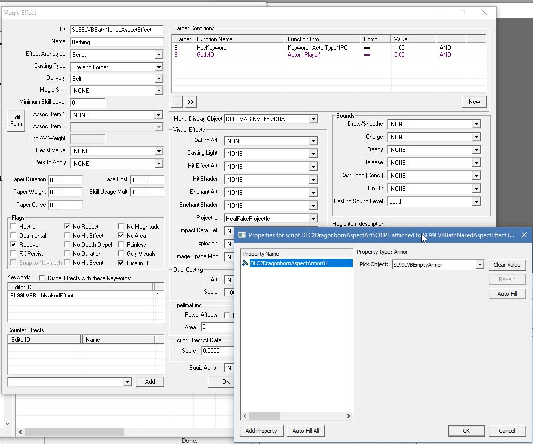 - 風呂に入ったNPCに何らかの方法を用いて、多数の装備Slotを占有するArmorAddonなしの装備品を強制的に装備させて脱衣させる。唯一見つけたのが魔法のScriptだったので脱衣魔法で行います。