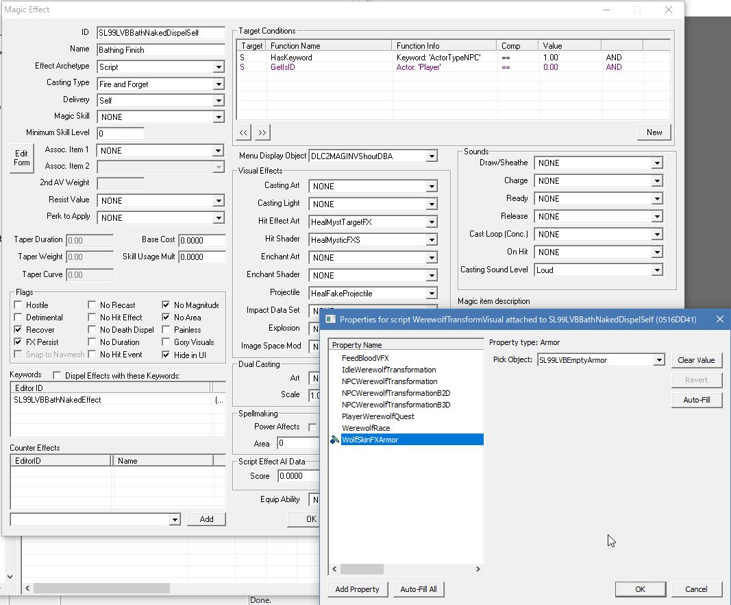 - 風呂から上がったNPCに何らかの方法を用いて、脱衣用の装備を持ち物欄から取り上げる。このタイミングで大体のNPCは自分のOutfit、フォロワーであれば最適装備に戻ってくれる。これも唯一見つけられたのが魔法Scriptだったので着衣魔法を作ります。ウェアウルフの変身用Scriptなので処理が多い。着衣魔法は脱衣魔法より若干処理が重いかも。