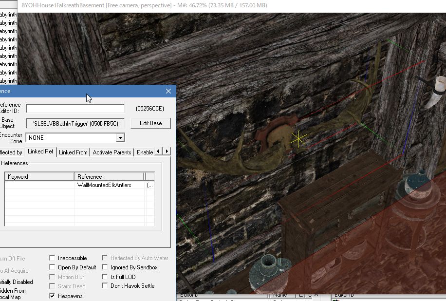 メッシュを持たないActivatorは普通には置けないです。まずは置きたい場所付近の床や壁や家具などを選択した状態で、CKの上部メニューにある「立方体にT字」のアイコンをクリック。小さなWindowが開くので、そこからさっき作ったTriggerを選択してOKします。