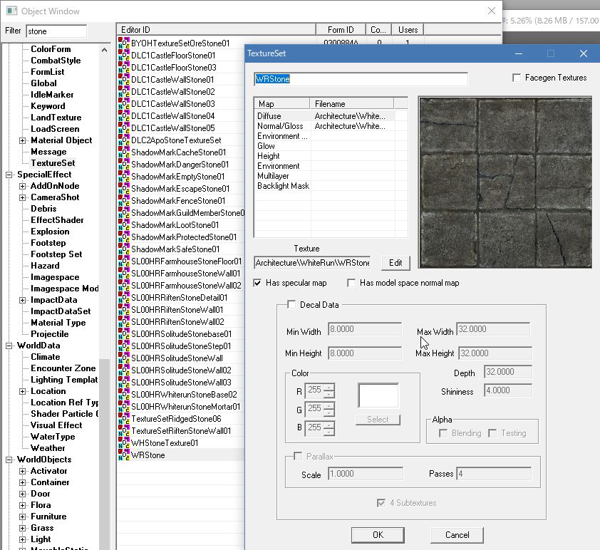 Object Windowのツリーから「Miscellaneous > TextureSet」選びます。右側の一覧に全テクスチャセットが表示されるので、ツリー上部の「Filter」に"stone"と入力して「WRStone」を探してください。探し出したら、ダブルクリックで開きます。