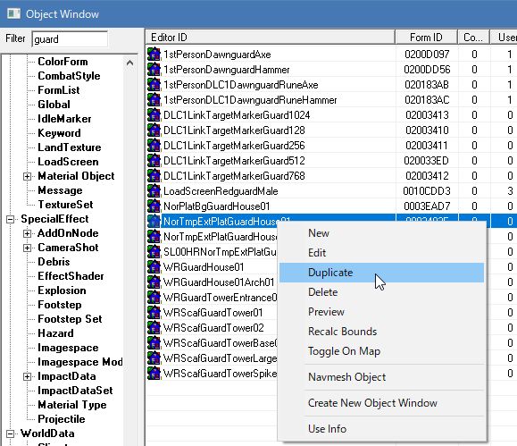 Object Windowのツリーから「WorldObjects > Static」選びます。右側の一覧に全Staticオブジェクトが表示されるので、ツリー上部の「Filter」に"guard"と入力してリストを絞り込み、「NorTmpExtPlatGuardHouse01」を探してください。