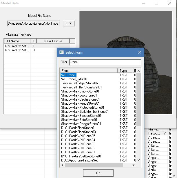 「Select Form」というウィンドウが開きます。ここでFilterに"stone"と入力すると、先ほどのテクスチャセット「WRStone」が見つかります。これを選択して「OK」ボタンを押します。