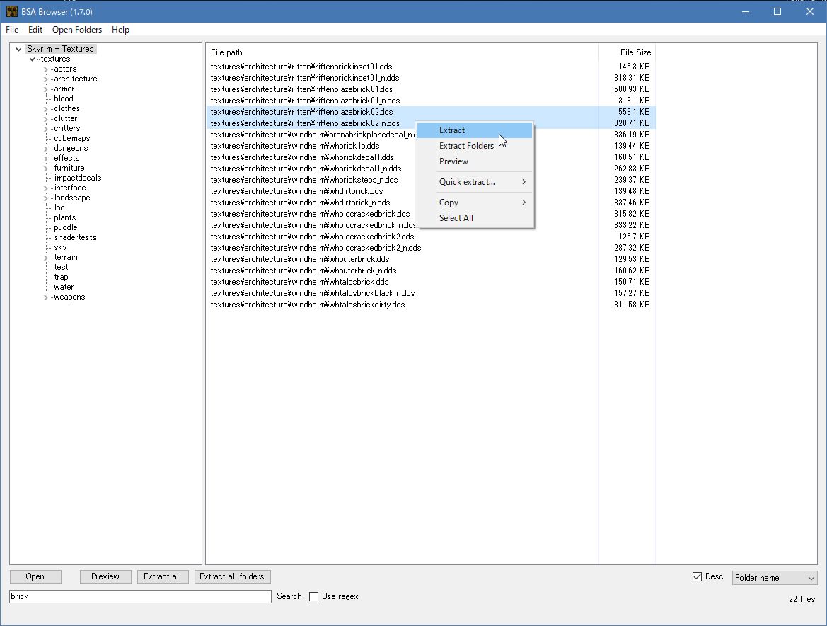 テクスチャなどは全て、bsaファイルに収められており、Dataフォルダから直接bsaファイルを探し出して解凍&中身を見ていく必要があります。