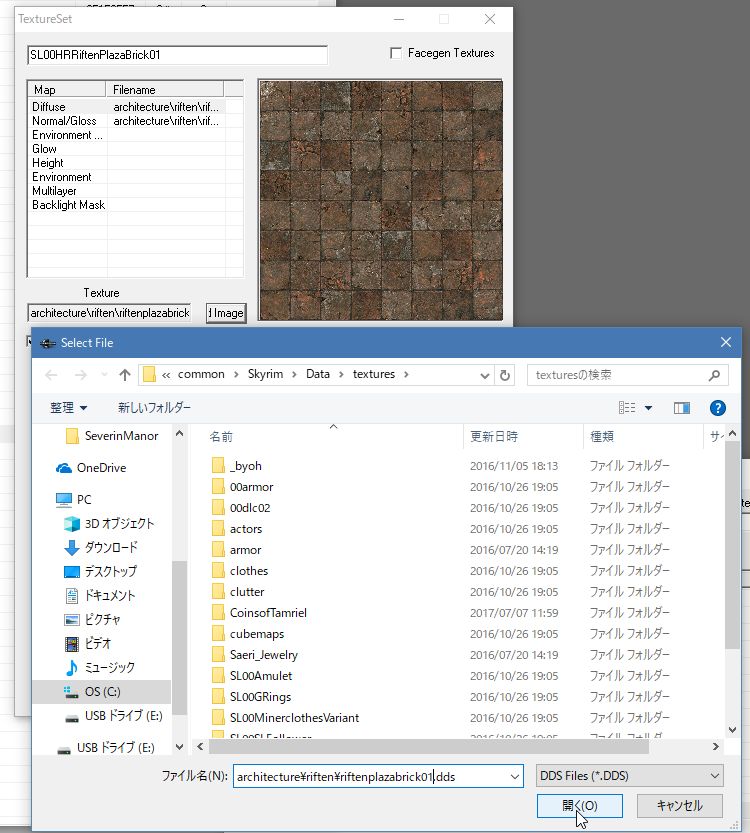 ファイルの選択場面が開くので、「ファイル名」のところにファイルパスを直接入力します。「BSA Browser」を使っている場合は、リスト上の該当テクスチャを選択して右クリック、Copyメニューからパスをコピーすることが可能です。それをそのまま張り付けて、パス冒頭の「textures¥」を削除します。今回の例では、「architecture\riften\riftenplazabrick01.dds」となります。