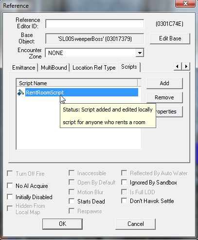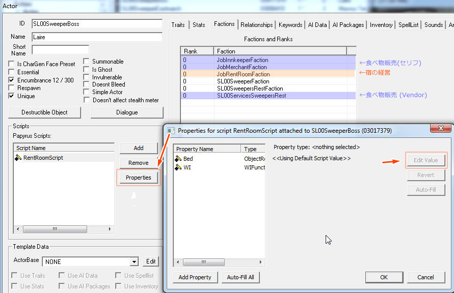 Propertyも先ほどと同じように設定。ゲーム内で動作確認をします。(追記:ActorデータにScriptをAddしておけば配置したReferenceにScriptの情報がコピーされるようなので、この操作はいらないかもしれません)