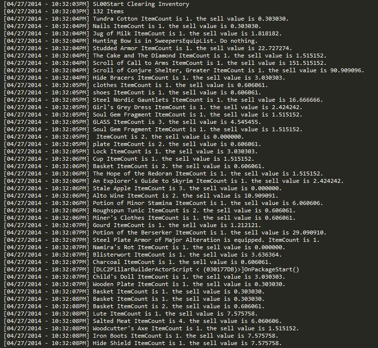 SKSEの”GetNthForm”で所持品から一種類ずつアイテムを取り出し、その値段に所持数を掛け合わせて、「話術スキル0」の時の売却係数で割ります。これを繰り返して、所持品を全て換金。