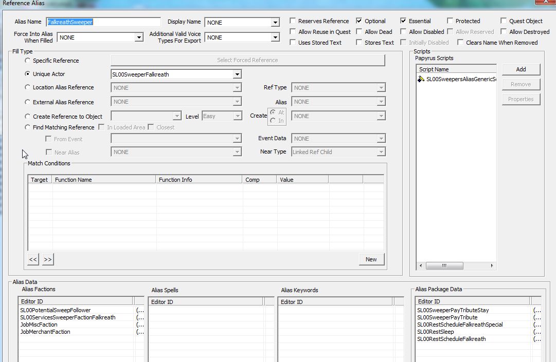 前者の解決法はシンプルで、養子になった後で消されたFactionを復活させるだけ。今回はプレイヤーとの会話から、元々ガエアに被せていたクエストAliasをつけ直すことでそれを行いました。このクエストAliasは掃除人達の月一の集会スケジュールを設定している物ですが、ガエアのAliasにだけ、復活させたいFactionも登録しています。ゲーム中このAliasを取り払うことはないから、この処理でもまあ問題ないでしょう。