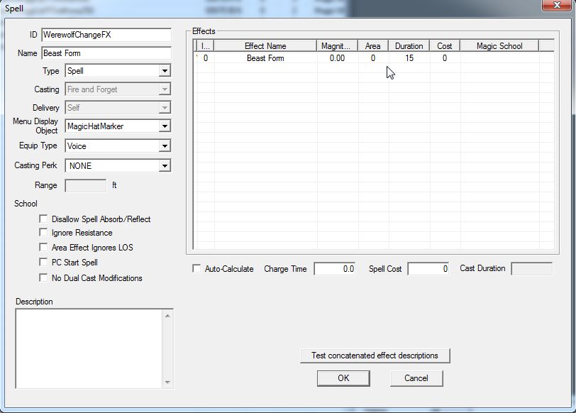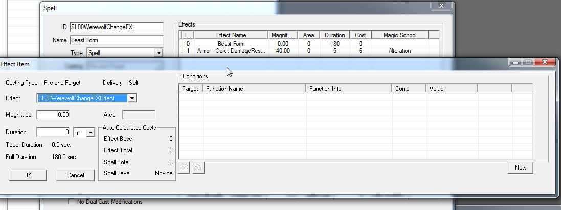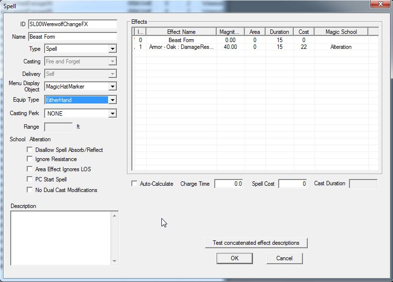 再び最初に作った自作のSpellを開き、Effectsに登録されていたBeast formを自作のMagicEffectに変更します。効果時間は3分にしてみました。