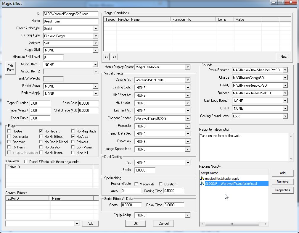 実は「WerewolfTransSpell」を人に向けて撃てるように改造して、町中の人をウェアウルフに変えて遊んでいたときに変身と解除の不安定さに気づいたので……。いえ、そんな無茶してたらおかしくなるのは当然なのかもしれませんが(汗) できるかぎり耐久性の高いModを作りたいと、CTD上等の大暴れテストプレイをやるときが時々あります。