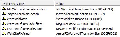 そこで、まずSpellの祝福のところをずっと眺めていたのですが、普段プレイしていて見慣れない祝福に「crWerewolfUnarmedDamage」というものがあることに気づきました。