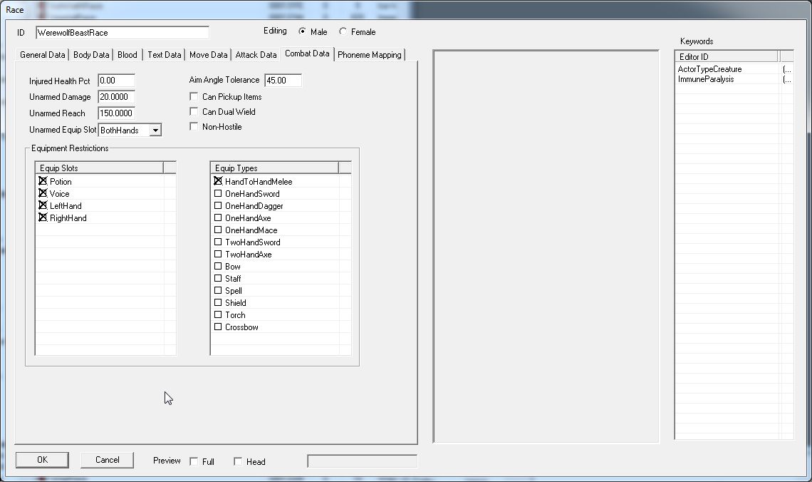Combat Dataタブ内を見ると、ウェアウルフが装備できるSlotと獲物のTypeの一覧がずらり。