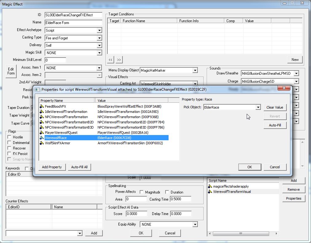 Scriptは、「WerewolfTransformVisual」のProperty"WerewolfRace"の値を、「ElderRace」に変更します。