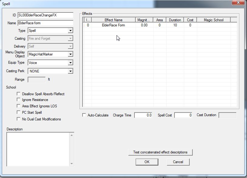 これで老人種族に変身するMagic Effectができました。バニラのScriptをそのまま使っているので、とても手軽です。