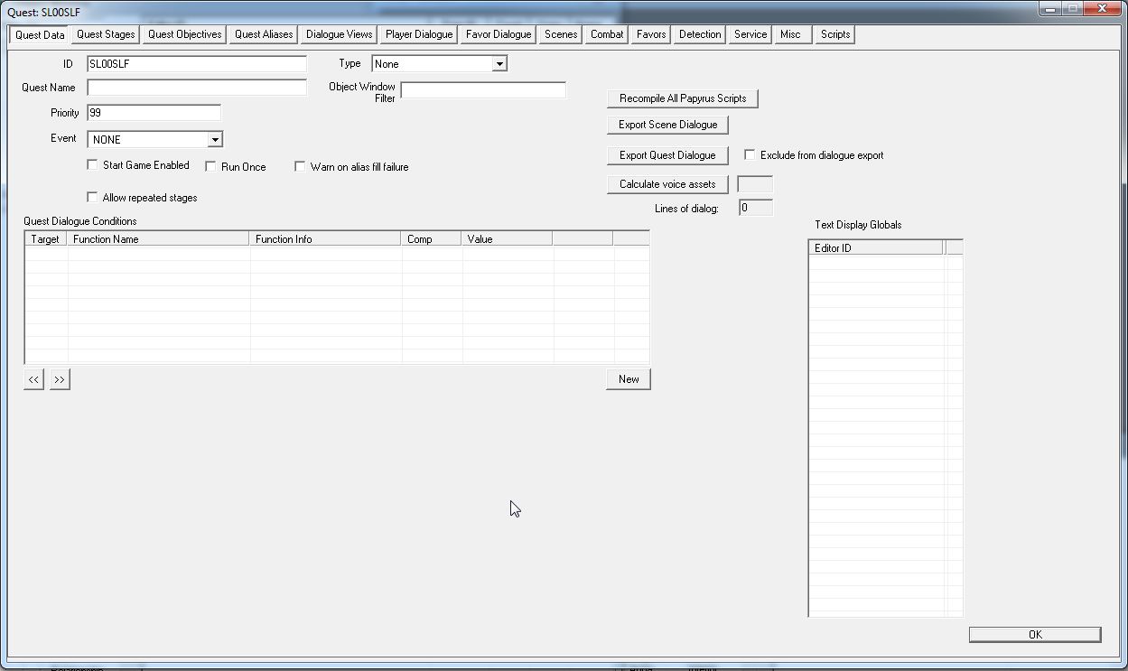 IDは分かりやすいものに。「Start Game Enabled」と「Run Once」のチェックをはずし、Priorityは「99」に設定します。ほぼ最強の優先度を誇るQuestです。