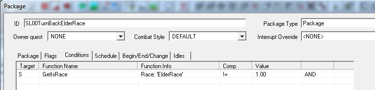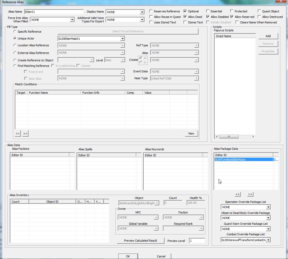 優先度99のクエストAliasなので、おじいちゃんをフォロワーとして雇っていても、ウェアウルフに変身していれば老人種族に戻る行動が最優先して行われます。老人に戻ればこのAI PackageはOFFになります。