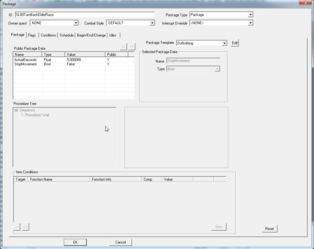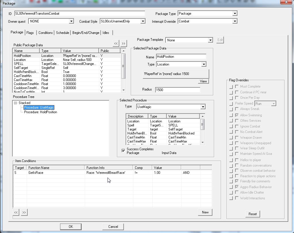 しかし戦闘中に複数のCombat Override Packageを自動切換えするのは、難しいようです(Scriptによる切り替えが必要らしい)。Packageの実行条件設定しだいですが、一回の戦闘で動かすのはCombat Overrideひとつだけ、と考えて作るのがいいように思います。(