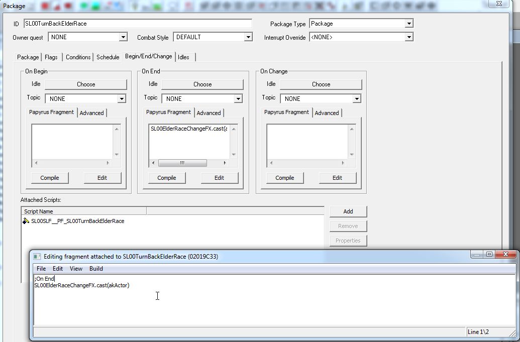 再度AI Packageを開き、Scriptを選択してPropertyボタンを押します。Propertyに「ElderRaceChangeFX(Spell)」を設定……。このあたりの操作は、