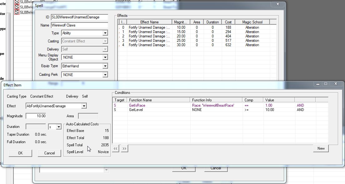ウェアウルフに変身する魔法も、同じ要領で作ります。ウェアウルフSpellだけ、Effectにオークフレッシュの効果を追加するのを忘れずに。これがないと、自分からウェアウルフ変身魔法を使ってくれません。