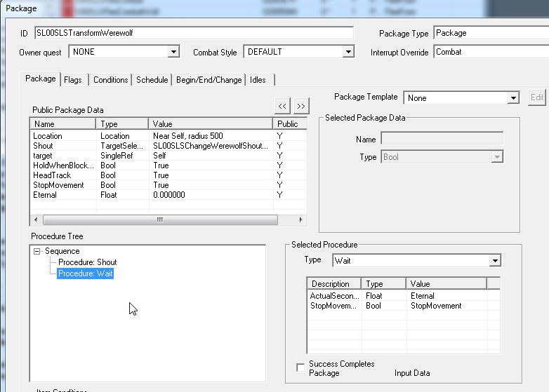 そのため、狼シンディングにはプレイヤーに追従するAI Packageが必要です。PackageのConditionsタブでは、人間シンディングがフォロワー状態になっているとき、で設定しています。