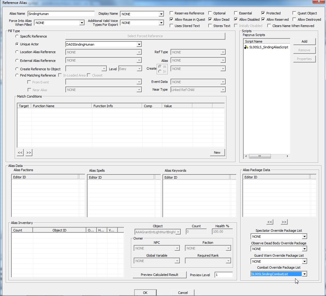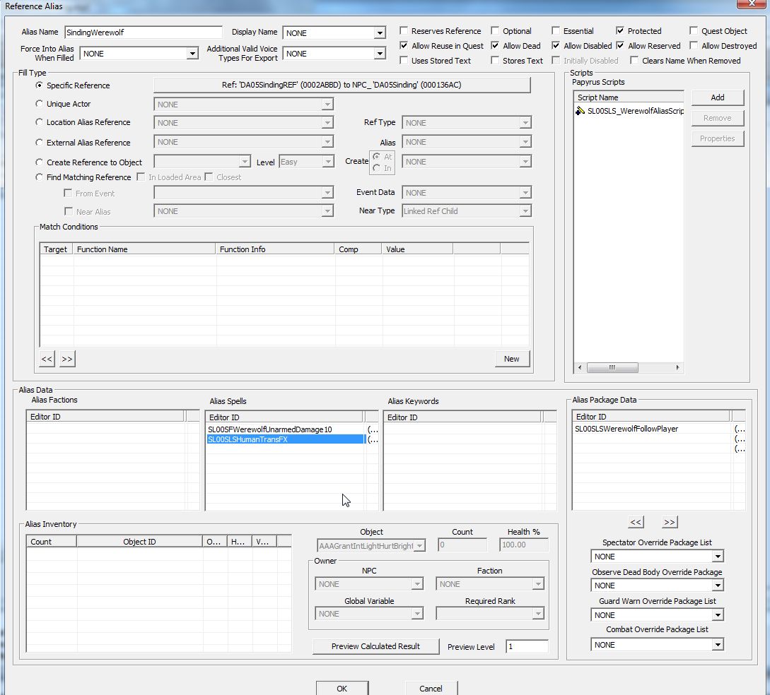 Actor置き換えの長所はそれぞれにカスタマイズの自由があることですが、最大の短所は変身前と変身後のNPCの同期(つじつま)をどう合わせるかでしょうか。生死の状態や、所持アイテム、装備品等々、けっこう大変そうです。シンディングについても「月明かりに照らされて」のクエストがクエスト完了後もずっと動き続けて人狼シンディングを監視しているので、人間形態とウェアウルフ形態との生死を同期させるのは諦めています。