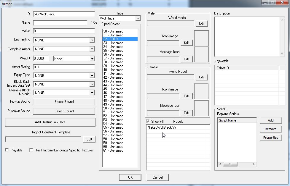 IDの隣にあるRaceの欄に"WolfRace"が選択されています。これは下のBiped Objectに種族に応じた各Slotの名前を表示させたりModels欄のRaceが一致するArmorAddonを表示するためのものらしく、装備可能種族を決めている項目ではないようです(