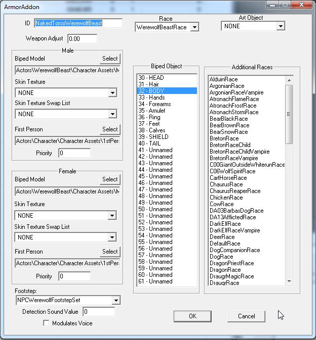 ただしバニラと同じウェアウルフを表示させるのであればわざわざ作る必要はなく、「NakedTorsoWerewolfBeast」というArmorAddonがそのまま使えるかと思います。ウェアウルフ種族の「皮」として使用されています。