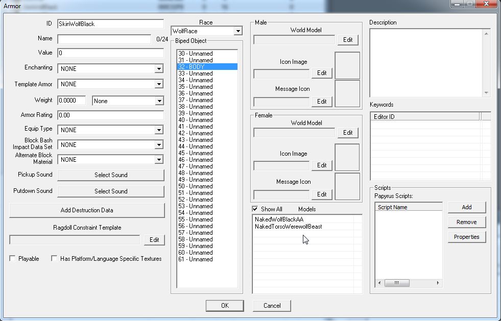 Biped Objectを見ると、狼種族では32番に"BODY"という名前が設定されているだけらしいです。また「SkinWolfBlack」は32番スロットを占有する装備であることが分かります。