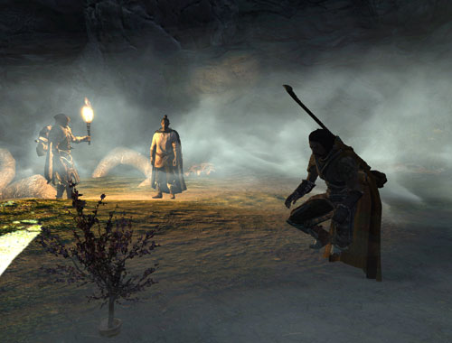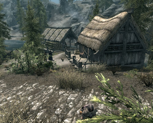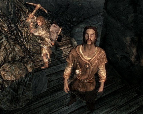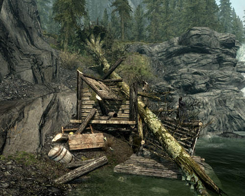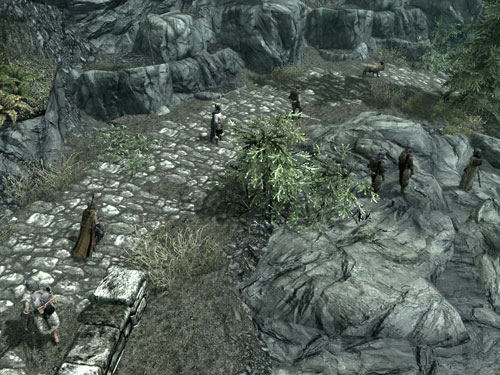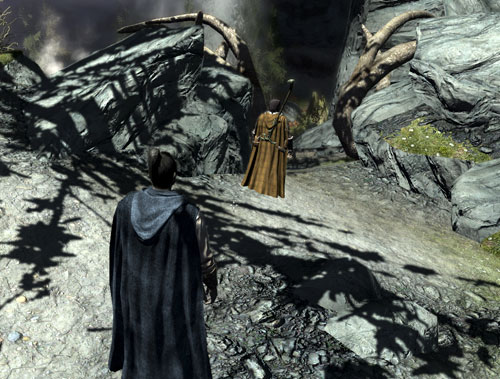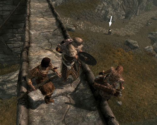 プレイヤーが橋の上の盗賊をファイアボルトでちんたら狙っているうちに、手前の塔の盗賊を殲滅したモーリスさんとドヴァキンが、橋の上を猛然と走っていくのが見えました。