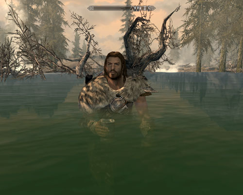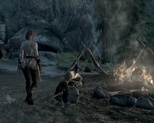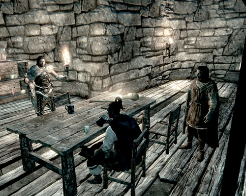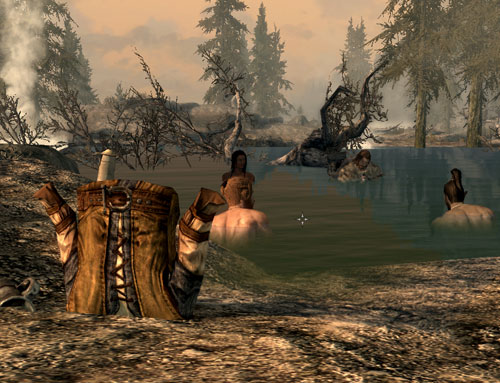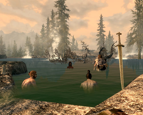 ちゃっかり狩人のお姉さんの隣に座っていたドヴァキン。温泉のお湯を飲んでました。運動不全症や重関節症に効きそう。