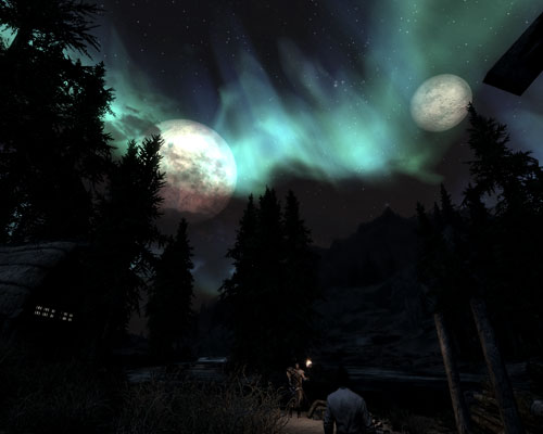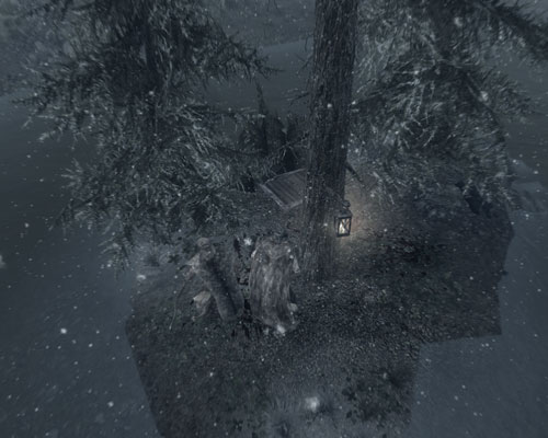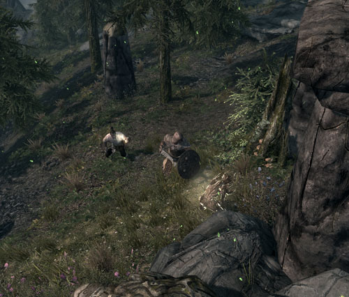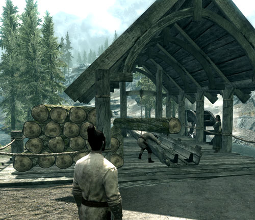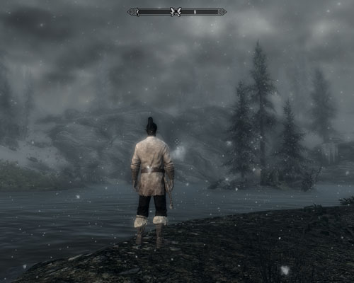 軽く薪割りで稼いだら、気分転換に西の斜面まで探索へ出かけます。ドヴァキンがあまりに退屈そうだったもので。