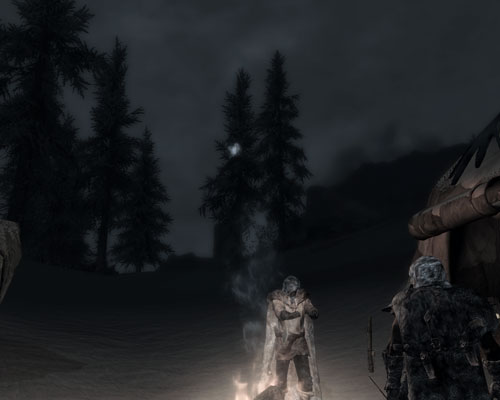 峠を抜けた先にアルフスタンドのキャンプが見えました。すぐさま焚き木に火をつけて、濡れた体を温めます。近くに凍死体だか焼死体だかよく分からないものが転がってますが、気にしている余裕がない。