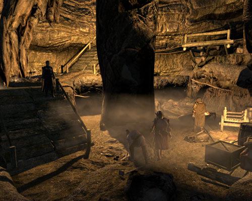 蜘蛛退治を渋っていたらしい衛兵さんも、鉱山前に陣取っている人は会話の最中鉱山に入ることで蜘蛛退治に強制参加させることができます。鍛冶屋さんの話では腰抜け衛兵の扱いになっていましたが、十分強いです。単に巨大蜘蛛が嫌なだけだったんじゃ……。