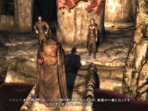 あの二人の権力争いに巻き込まれたのかしら。そうこう話を聞くうち、サロニアが手柄を独り占めしようと仲間割れを始める始末。怒るスタルフさんでしたが、うちのドヴァキンが物理的に二人を黙らせて場を収めてくれました。
