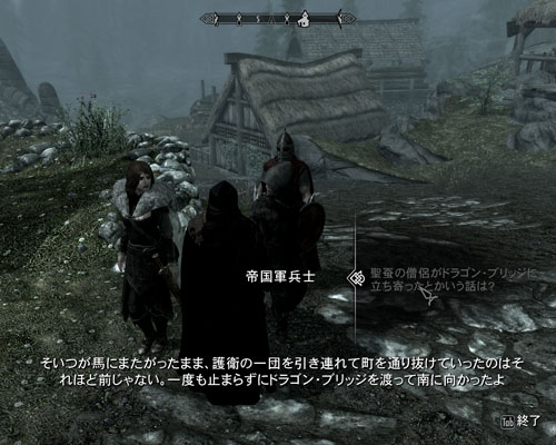 再びソリチュードまで戻りました。宿の主人に僧侶を見かけなかったか尋ねると、これ見よがしに知っているとのこと。行き先まで聞いているらしい。