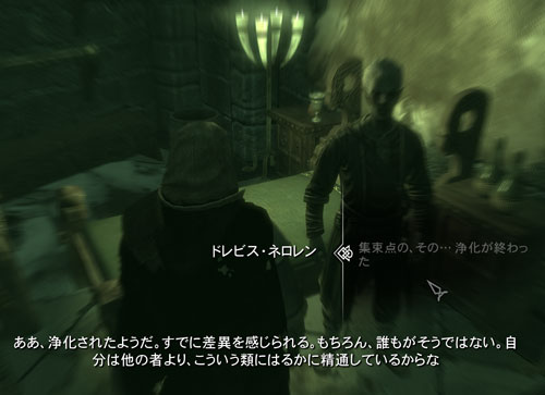 幻惑魔法のドレビス先生は、収束点の浄化を依頼してきました。が、収束点が汚染されていたかどうかは結局彼にしか分からないものらしく、プレイヤー自身でさえいまいちよく分からないまま浄化した感じが、会話選択肢ににじみ出ています。
